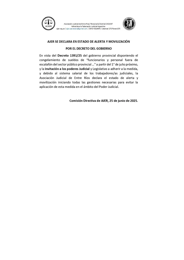 La Asociación Judicial de Entre Ríos (AJER) declaró el estado de alerta y movilización a raíz del Decreto 1391/25 del gobierno provincial, que dispone el congelamiento de sueldos de «funcionarios y personal fuera de escalafón del sector público provincial» a partir del 1° de julio próximo.