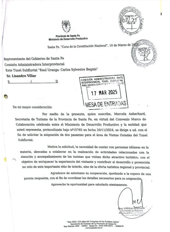 Al respecto, explicaron que “en marzo de 2025 la secretaria de Turismo de Santa Fe, Marcela Aeberhard, en virtud del convenio marco celebrado entre el Ministerio de Desarrollo Productivo y el Ente Túnel Subfluvial, solicitó la incorporación de dos pasantes para el área de visitas guiadas del Túnel Subfluvial”. La erogación de esto queda a cargo del mencionado Ministerio santafesino.