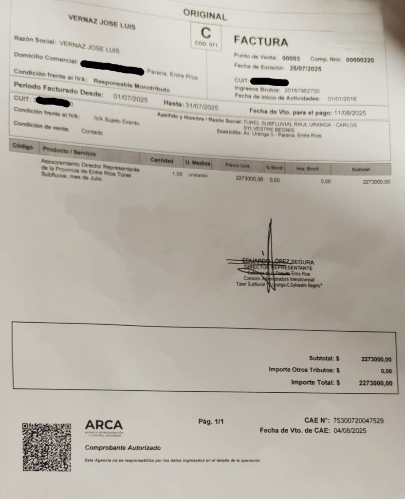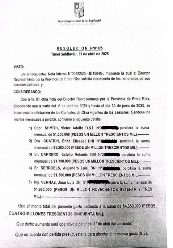 Según la Resolución N°81/25 del 29 de abril de 2025 se dispuso que “a partir del 1 de abril de 2025 y hasta el 30 de junio de 2025, se incremente la retribución de los Contratos de Obra vigente de los asesores” del director entrerriano del Túnel Subfluvial. Cuatro de ellos pasaron a cobrar 1.300.000 pesos y un quinto asesor pasó a cobrar 1.973.000 pesos. No conforme con ello, en junio volvieron a pagarse incrementos de 300.000 pesos, y uno de ellos facturó 2.273.000 pesos “por asesoramiento al director representante de la provincia de Entre Ríos, en el mes de julio”.