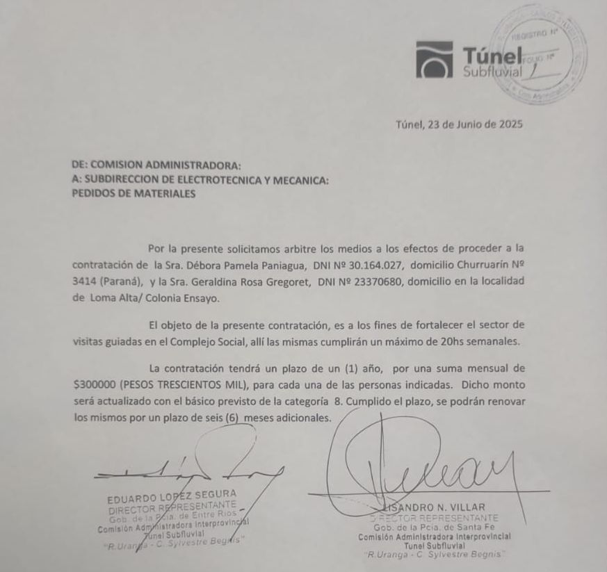 Con posterioridad, el 23 de junio de 2025 se solicitó desde Entre Ríos la incorporación de otras dos personas, Débora Pamela Paniagua y Geraldina Rosa Gregoret, “para fortalecer el área de visitas guiadas en el Complejo Social” del Túnel cumpliendo “un máximo 20 horas semanales”. Dicha contratación tiene “un plazo de un año por una suma mensual de 300.000 pesos para cada una de las personas mencionadas”. Cabe destacar que en este caso no se trata de pasantes, sino de monotributistas.