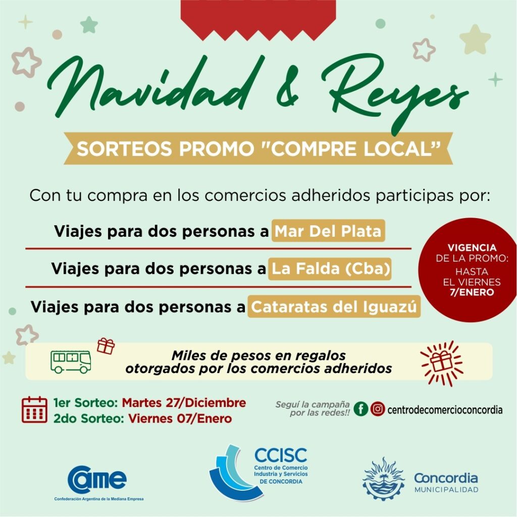 Los sorteos se realizarán los días martes 27 de diciembre de 2021 (sorteo navidad) y el viernes 7 de enero de 2022 (sorteo reyes) en la sede del Centro de Comercio, Industria y Servicios, La Rioja 622 Concordia, ante autoridades del CCISC, la Confederación Argentina de la Mediana Empresa (CAME) y la Municipalidad de Concordia.