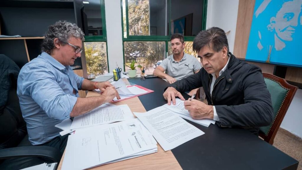 El Presidente Municipal de la ciudad de Federación Ricardo Bravo, acompañados de sus Secretarios de Obras, Luis Espil, de Gobierno y Hacienda, Carlos Miller, firmó un convenio urbanístico con el empresario hotelero local Ariel Burna, en la mañana de este viernes 7 de junio.