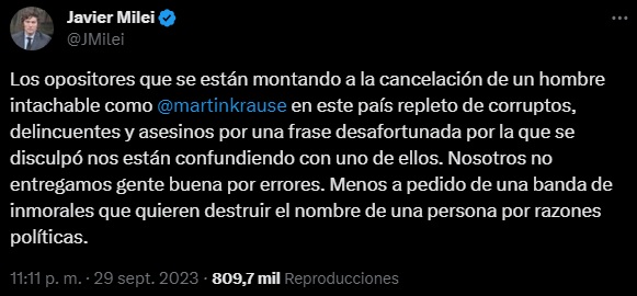 «Los opositores que se están montando a la cancelación de un hombre intachable como Martin Krause en este país repleto de corruptos, delincuentes y asesinos por una frase desafortunada por la que se disculpó nos están confundiendo con uno de ellos», publicó Milei en las últimas horas en su cuenta de la plataforma X (exTwitter).