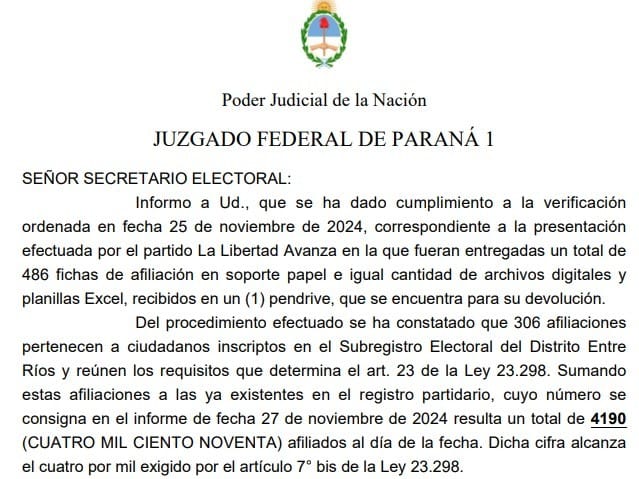 En una gacetilla enviada a nuestra redacción, dan a conocer la resolución del Juzgado Federal de Paraná, oficializando el nuevo partido político en nuestra provincia.