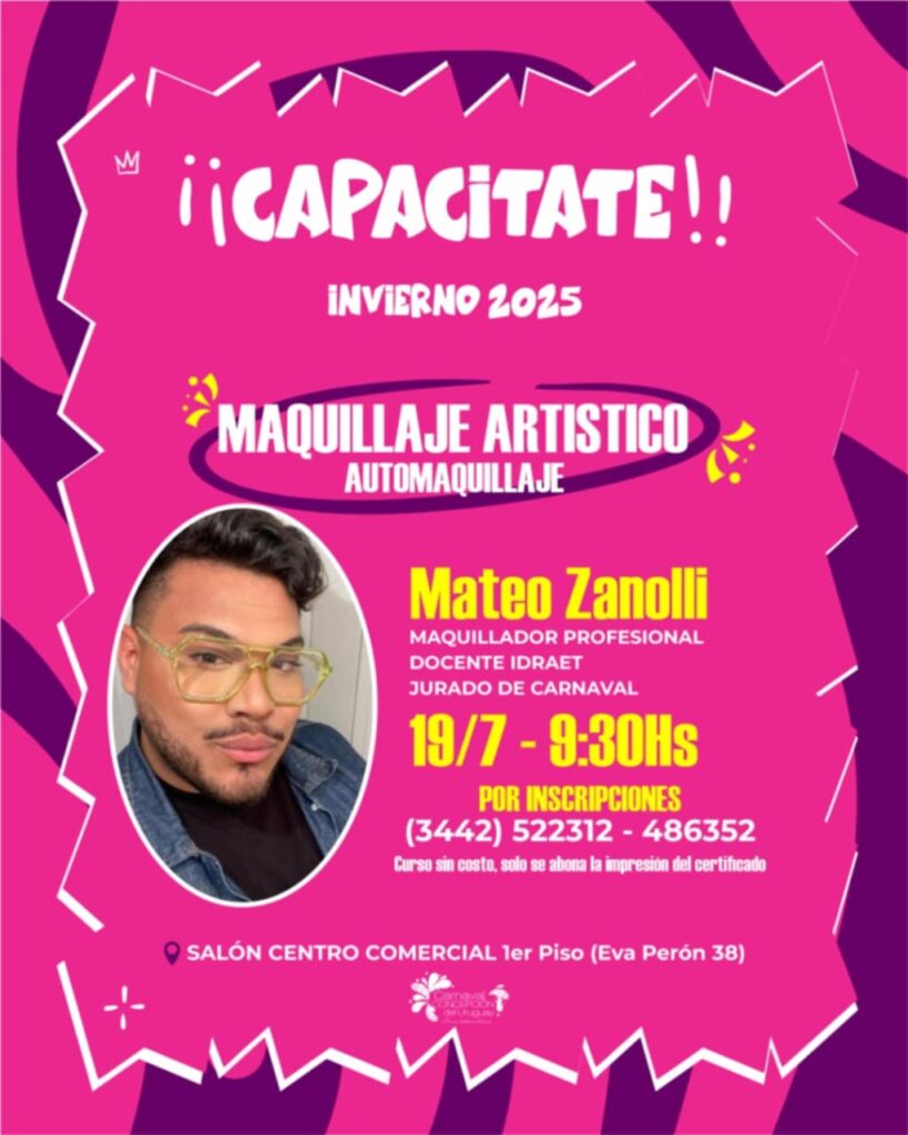 A cargo de Mateo Zanolli, maquillador profesional, docente en Idraet y jurado de carnaval. Se dictará en el 1er piso del Centro Comercial (Eva Perón 38).