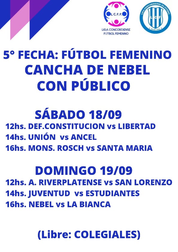 En tanto hoy se procedió a programar la 5ta. fecha del fútbol femenino, que se jugará como ya es habitual, desdoblada en cancha del Club Defensores de Nebel.